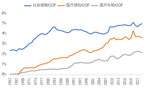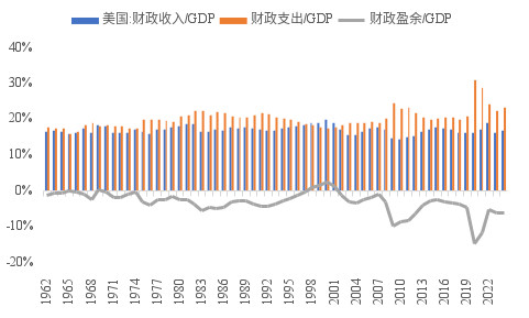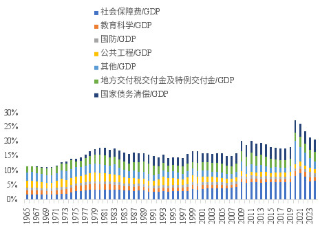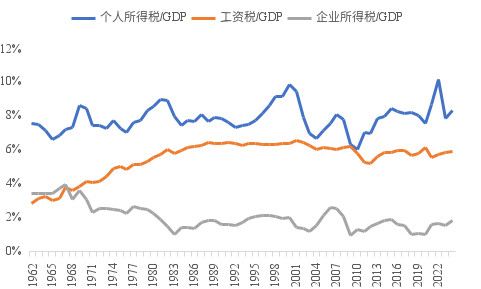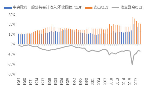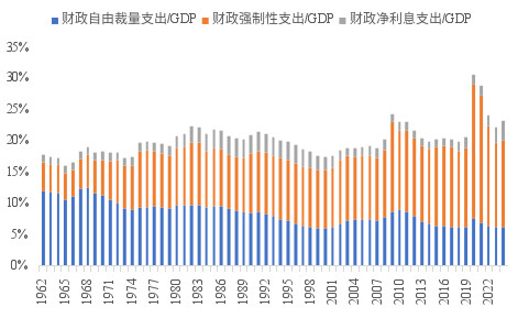 从各项支出占GDP的比重看,强制性支出占GDP的比重从1962年的5%明显上升至2024年的14%,2020年最高达21%;自由裁量支出从冷战背景下超过10%的高点降至90年代末的6%左右水平,2010年前后由于反恐战争又阶段性上升至9%左右,目前回落至6%;利息支出受债务绝对规模增长和利率水平影响,目前已超GDP的3%。