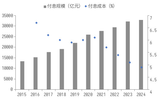 我国中央政府的杠杆率水平并不高,杠杆率水平约26%,远低于日本、美国等发达国家,但隐债的规模不小。截至2024年末,全国各省城投平台有息债务合计67万亿元,平均付息成本4.9%,较去年同期下降约20BP,年付息规模约3.3万亿元。