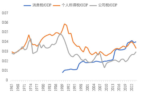 日本中央政府前三大税种为消费税、个人所得税、公司税。个人所得税和公司税占GDP比重自80年代末高点有明显下降,目前消费税已成为第一大中央税种。自1989年4月首次引入3%消费税以来,税率分别于1997、2014、2019年上调至5%、8%、10%。但消费税具有累退性,对低收入群体负担比重更大。