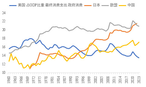 我国政府消费占GDP比重约17%左右,明显低于日本、欧盟。当然,这可能与政府支出结构有关,比如,美国政府消费率仅有13%左右,主要原因是医疗保险和医疗补助支出被计入转移支付,并最终转化为居民在医疗保健上的个人消费,未被计入政府消费,因此尽管美国政府消费低,但包括转移支付在内的社会性支出总量并不低,也能更好发挥市场作用。