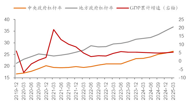疫情以来中央、地方政府杠杆率均持续上升,分别从2019年末的16.7%、21.2%上升至2025年一季度末的26.4%、36.8%,说明地方政府的杠杆率水平上升更快,主要原因是近年来发行地方政府专项债券。
